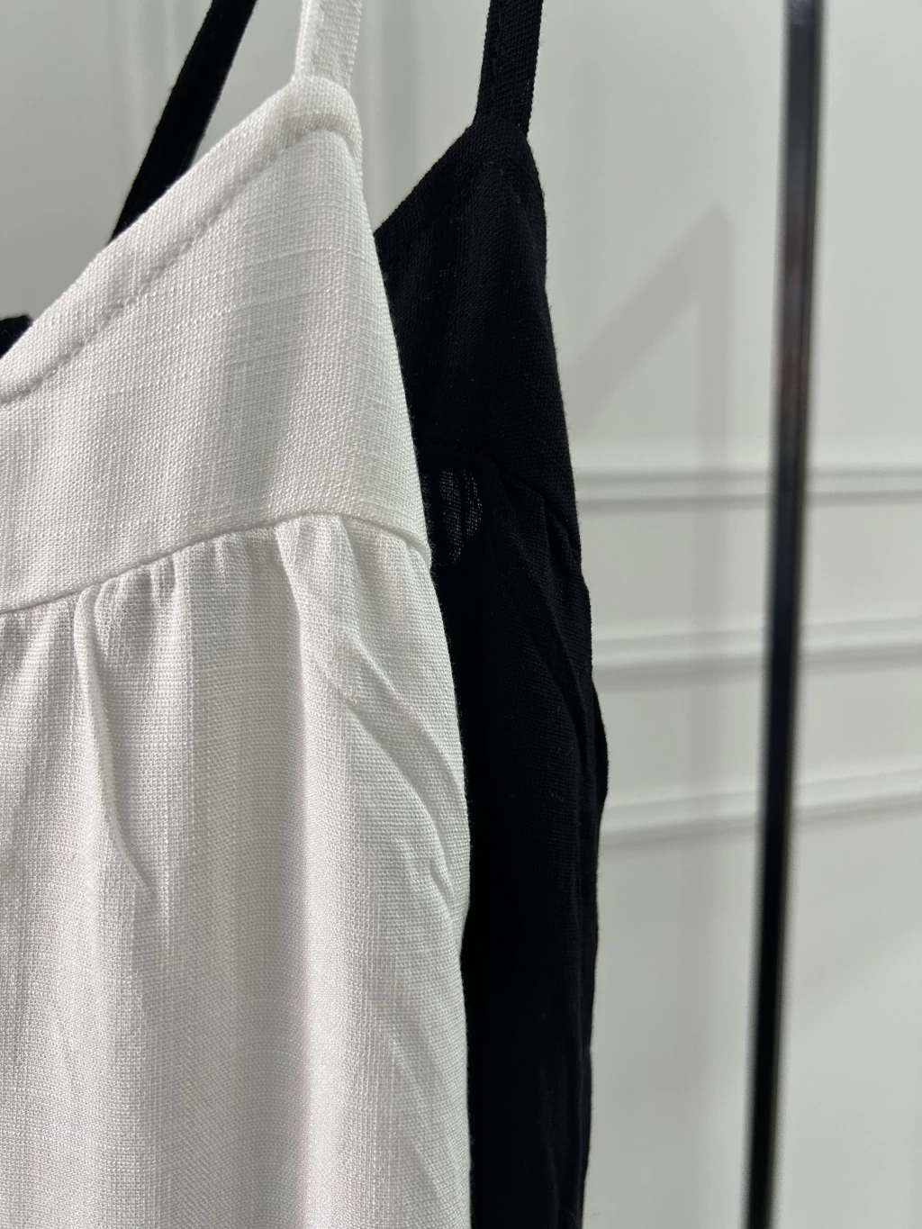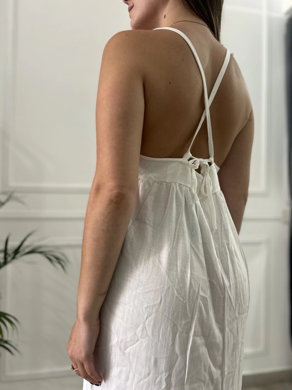 Breteles finos que se anudan en la espalda, ideal para ajustar a medida y dar un toque delicado.